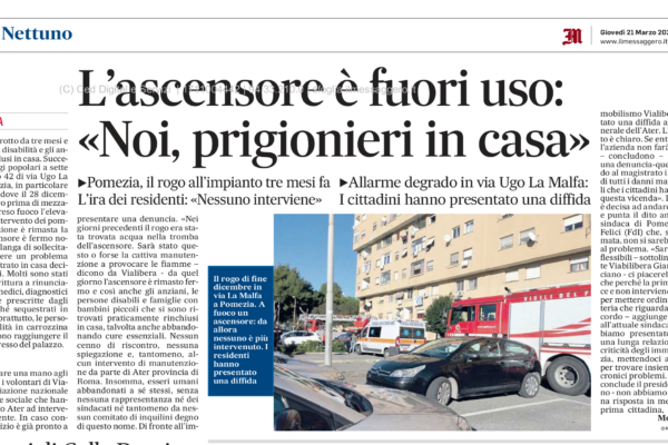 E’ successo il 28 dicembre 2023 quando gli inquilini delle case Ater a Pomezia in Via Ugo La Malfa, 42, ingresso H, sentono un forte boato seguito da un incendio all’impianto dell’ascensore che porta fino al settimo piano. Nei giorni precendenti era stata trovata acqua nella tromba dell’ascensore. Sarà stato questo o forse la cattiva…